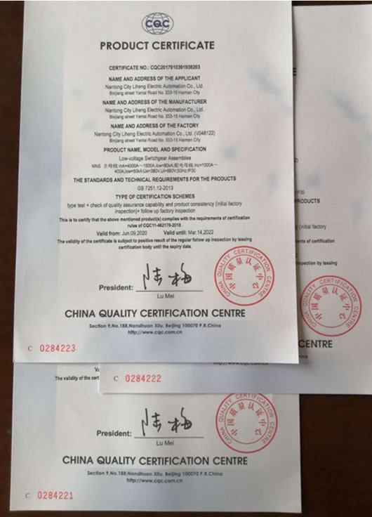 2020年6月9日,經(jīng)國家質(zhì)量認(rèn)證中心確認(rèn),我司生產(chǎn)的低壓抽出式開關(guān)柜、交流低壓配電柜、動力配電箱等一系列低壓成套開關(guān)設(shè)備產(chǎn)品質(zhì)量符合CQC11-462176-2018認(rèn)證規(guī)則要求,再次獲得中國質(zhì)量認(rèn)證中心頒發(fā)的產(chǎn)品認(rèn)證證書。